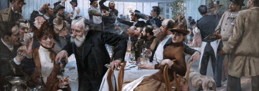 Debout, levant sa coupe de champagne en honneur de son ami le sculpteur finlandais Ville Vallgren, Albert Edelfelt apparaît au coeur du célèbre tableau d’Hugo Birger représentant les artistes nordiques festoyant à Paris au Pavillon Ledoyen. Situé sur les Champs-Elysées, le restaurant était idéalement placé à proximité du Palais des Champs-Elysées, et permettait aux artistes de se retrouver après les vernissages du Salon des Artistes français.