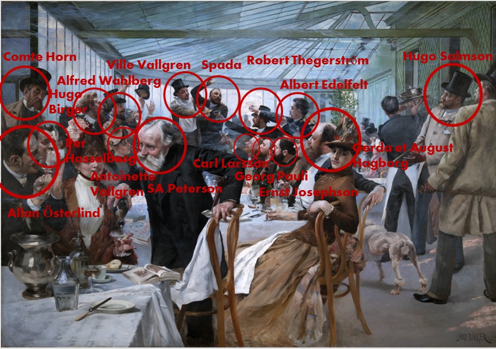 Devenu légendaire, le portrait de groupe d’Hugo Birger, qui se représentait aux côtés de ses amis, a alimenté d’innombrables commentaires, ainsi qu’un jeu d’identification des visages. Les peintres August Hagborg et son épouse Gerda, Ernst Josephson, Carl Larsson, Georg Pauli, Hugo Salmson, Robert Thegerström, Alfred Wahlberg, Allan Österlind, les sculpteurs Per Hasselberg et Antoinette Vallgren, épouse de Ville Vallgren, du correspondant du Stockholms Dagblad Johan Christian Janzon dit Spada et du comte Horn, entourent les héros du jour.