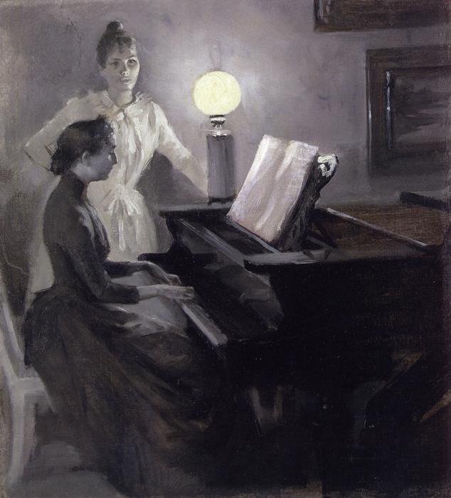 Voici une charmante chose de M. Edelfelt : Au piano. Le jour tombe ; celui qui entre dans la pièce lutte avec la lueur d’une lampe, éclairant deux virtuoses en toilettes claires, qu’écoute bonne maman, en noir, à droite de l’instrument. C’est très observé, très fort… et pas ennuyeux du tout, je vous assure, car en dépit de l’observation, c’est encore largement fait.