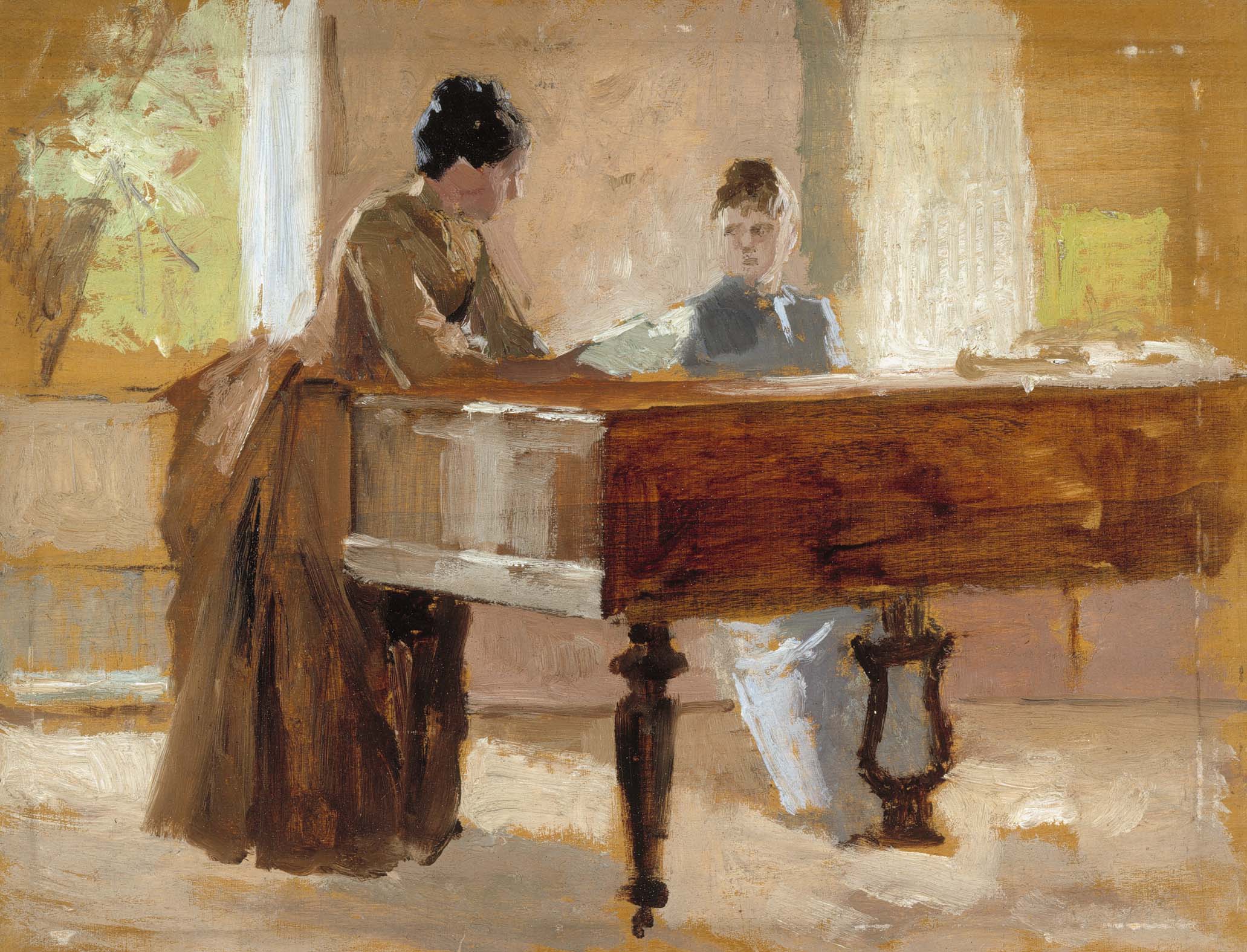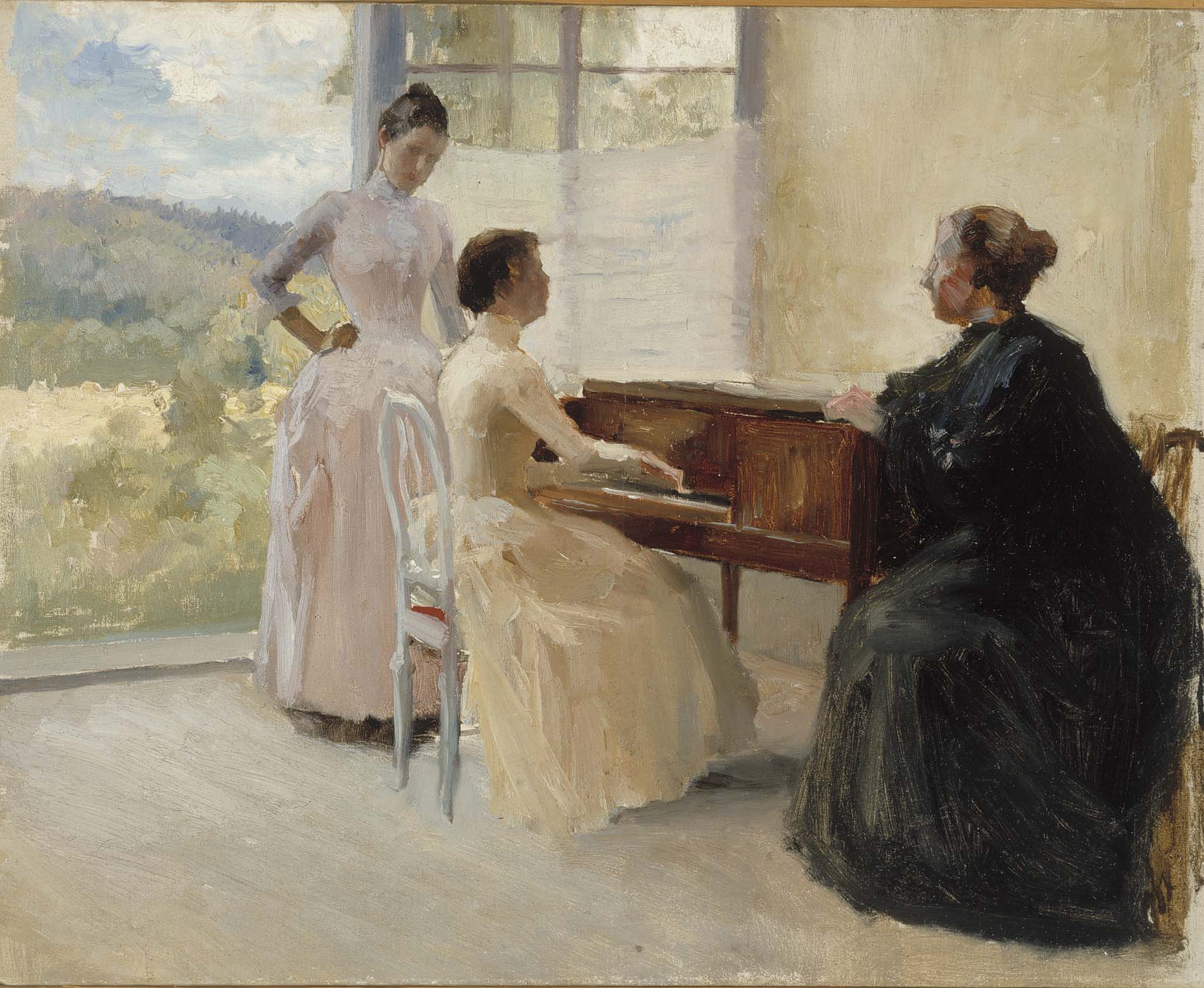 - « The Coming Salon », The New York Herald, Paris, 13.4.1889 : At the Mirlitons, Mr Edelfelt exhibits A Young Girl at the Piano. The listening attitude of the mother is inimitable.